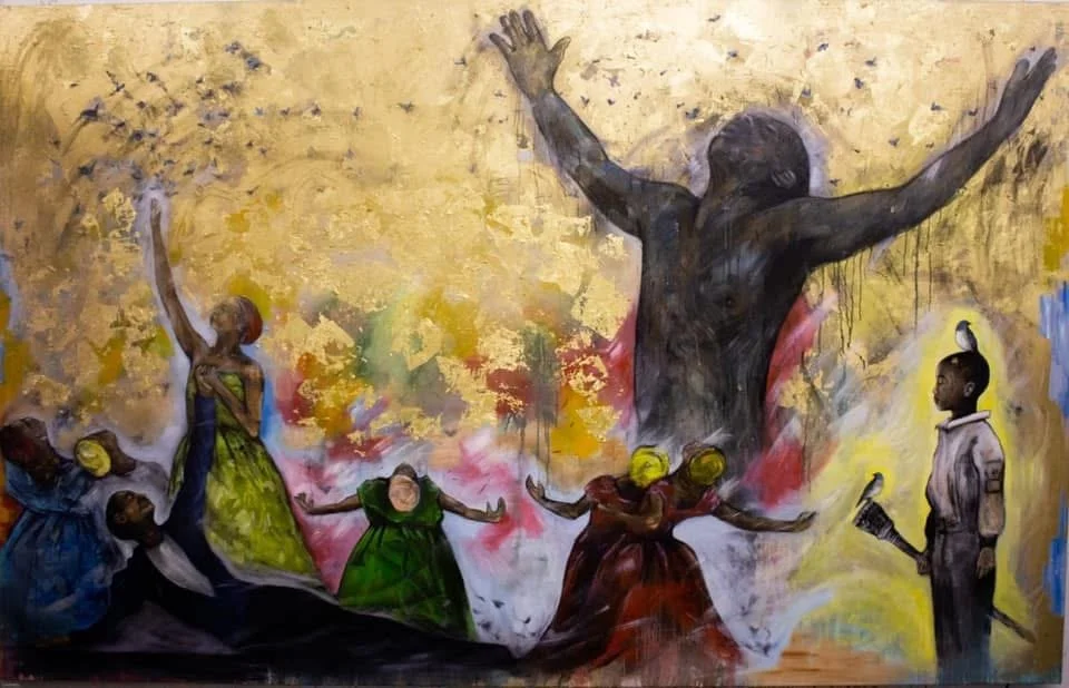 Rendered in charcoal, oil, and ash, the work evokes the weight of history and the lightness of transcendence. Figures emerge not as static portraits but as becomings—unfolding souls suspended between the man they were told to be and the man they are discovering themselves to be. The surfaces bear witness to fracture, to fire, and to freedom.