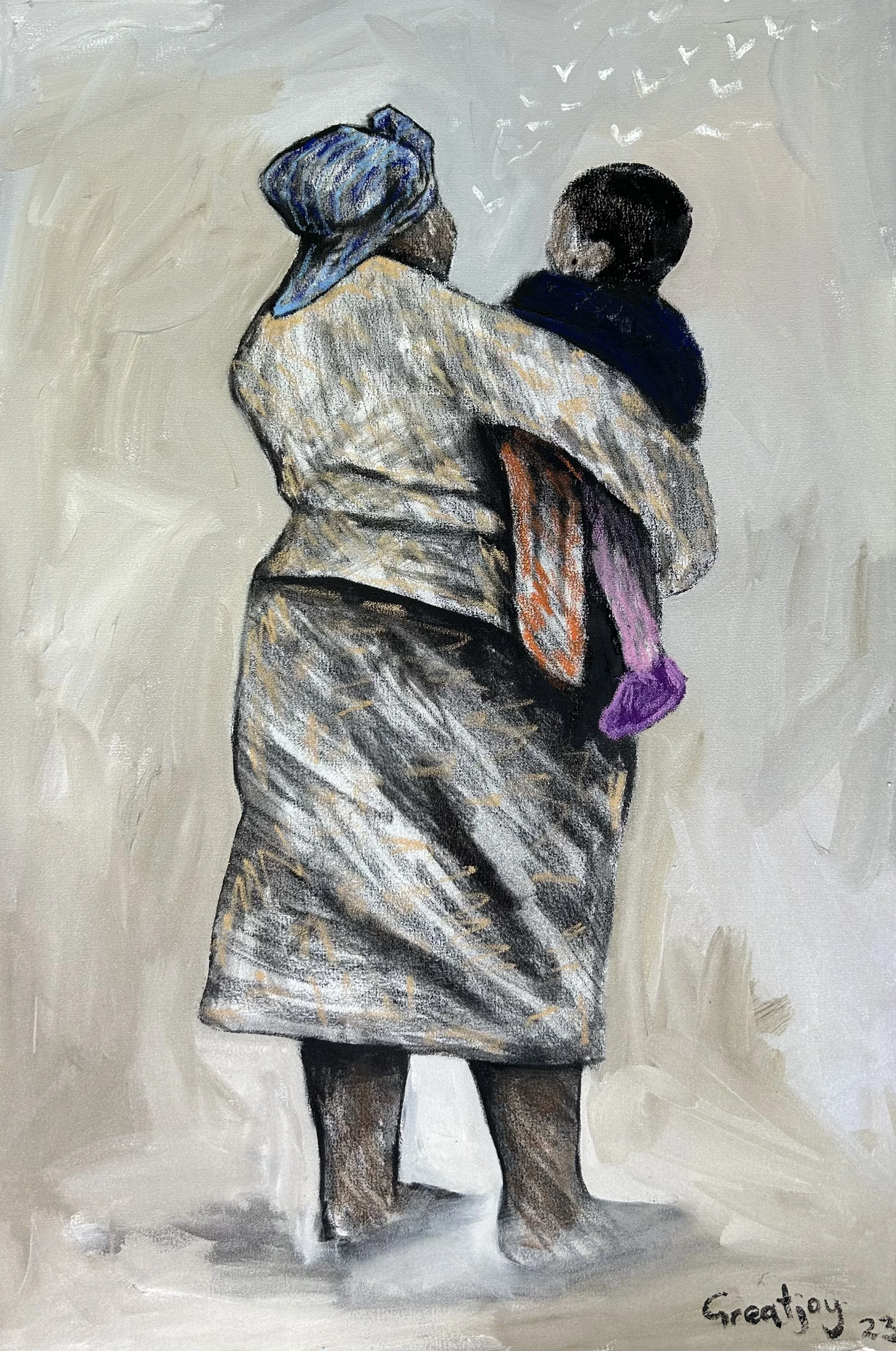 Masterfully rendered on canvas using charcoal and premium oil paint, 'Grandma’s Foresight I' is a captivating ‘Concessions’ original by Greatjoy Ndlovu.