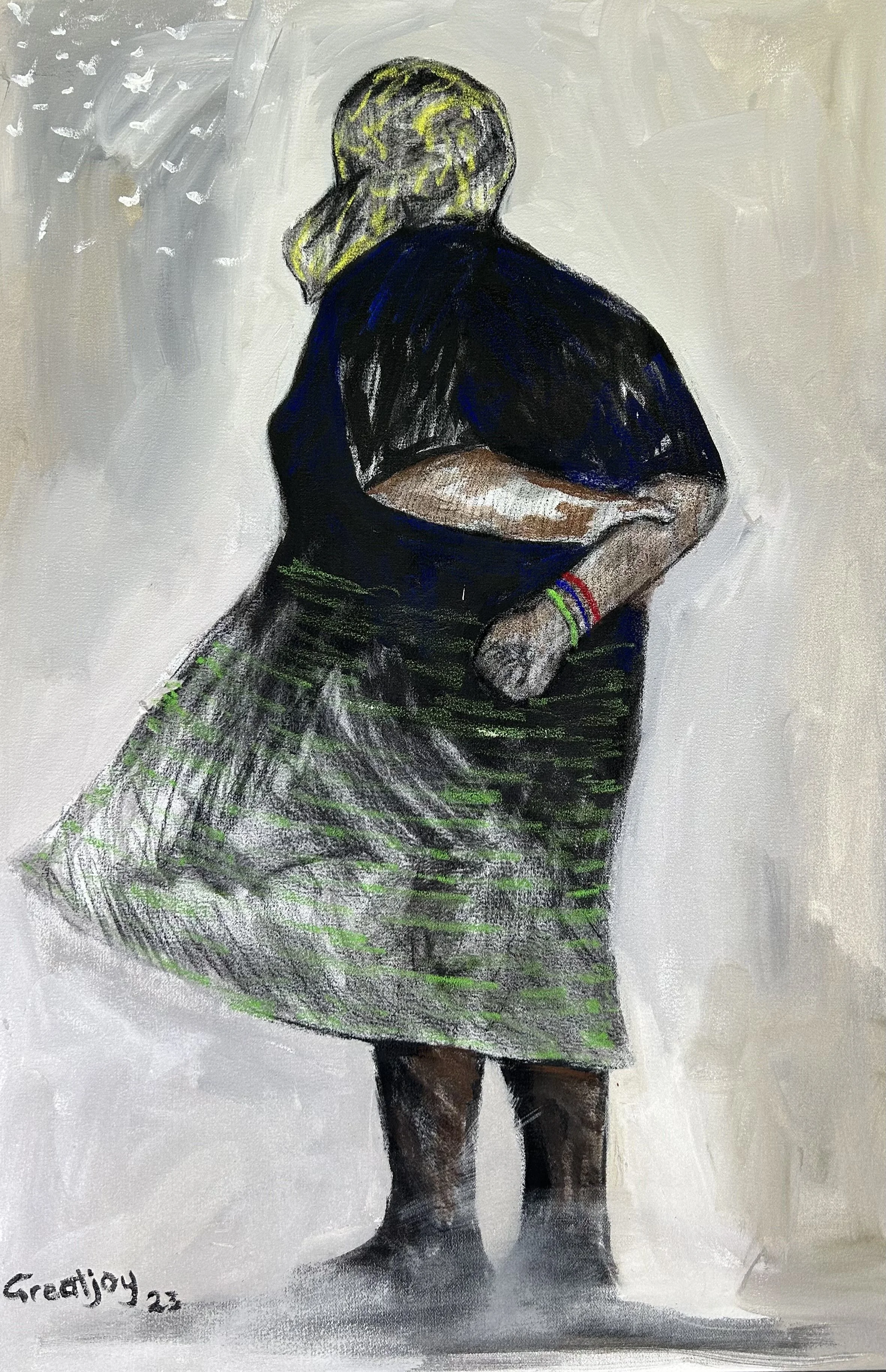 Masterfully rendered on canvas using charcoal and premium oil paint, 'Grandma’s Foresight II' is a captivating ‘Concessions’ original by Greatjoy Ndlovu.